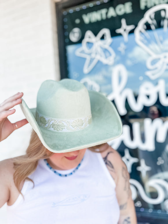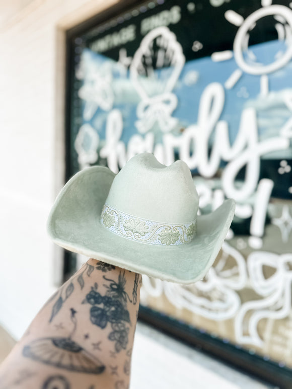 Visit our hat bar packed with a wide range of hats and unique accessories such as vintage scarves, custom hatbands, curated charms, dried florals, matchbooks, feathers, and more!