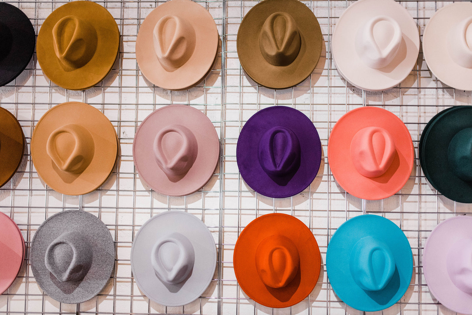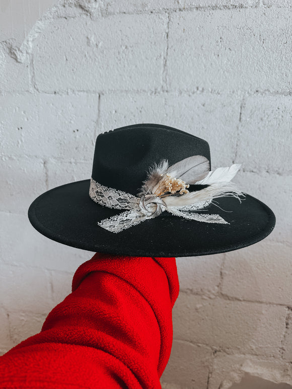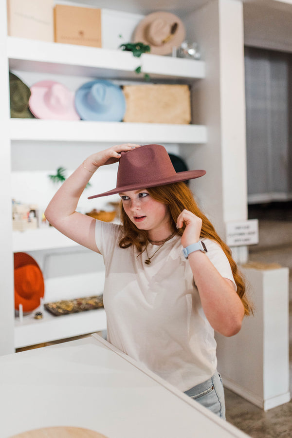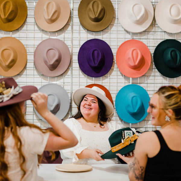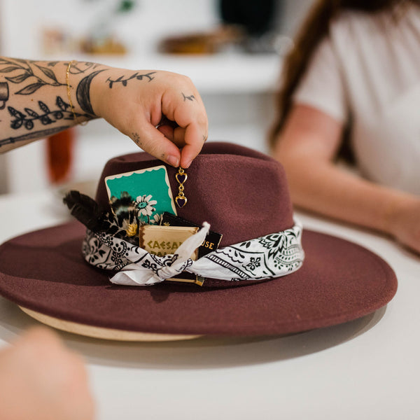 Visit our hat bar packed with a wide range of hats and unique accessories such as vintage scarves, custom hat bands, curated charms, dried florals, matchbooks, feathers, and more!